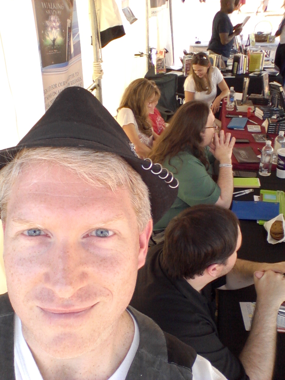 On Friday I shared the tent with Ryan Hill, author of the metaphysical comedy The Book of Bart and the upcoming zombie novel Dead New World. Saturday we were joined by Elsie Elmore, Matthew Graybosch, and CQ power-hitters Michael Shean and Krystal Wade. Together we FIGHT CRIME! Oh wait… actually we sold books.